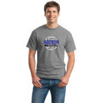 T-shirt with front chest logo. 6.1-ounce, 100% cotton (preshrunk jersey knit) Seamless double-needle 7/8" collar Double-needle sleeves and hem Taped neck and shoulders cotton/poly. Sports Grey 90/10 cotton/poly.